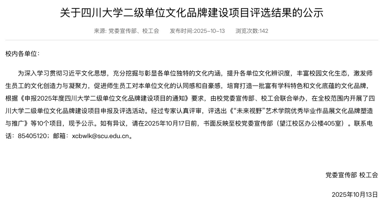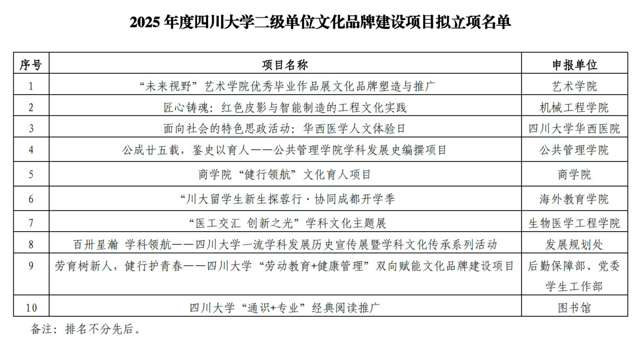 近日,四川大学党委宣传部、校工会发布2025年度四川大学二级单位文化品牌建设项目立项结果,经全校范围的申报、评选及专家评审,共立项10个项目,我院申报的“公成廿五载,鉴史以育人——新葡的京集团35222vip学科发展史编撰项目”成功获批立项。该项目旨在通过梳理学院相关学科的发展历史,展现学院与学校共同成长历程中的办学成就与办学特色,挖掘、传承与弘扬公管精神与学科底蕴,增强师生荣誉感、归属感,献礼130周年校庆与25年院庆。学院还立项了党建特色项目“以史育人:学院公共管理学科发展史编撰项目”,也旨在支持学院学科发展史编撰工作。