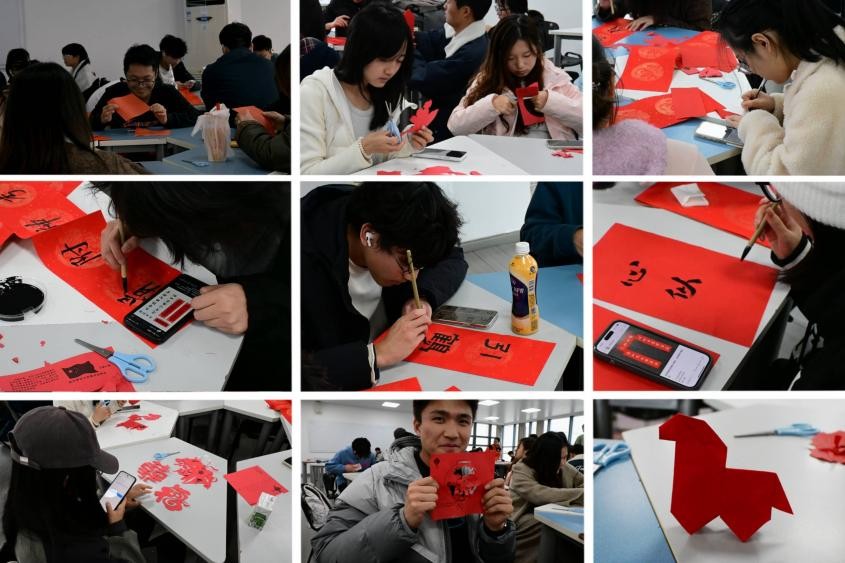 本次班会活动由班长张渝荣主持,班会分为答疑交流、书写对联与剪纸迎春三个环节。班主任马秀美老师围绕学业发展、时间管理与职业规划等方面与同学们进行交流,分享经验建议,鼓励大家科学制定目标,积极迎接新阶段的学习任务。在“笔落新愿”环节,同学们现场书写新春对联,以传统形式表达对新年的美好期许。随后的“红纸生花”剪纸活动中,班主任与同学们共同参与创作,活动现场气氛融洽。