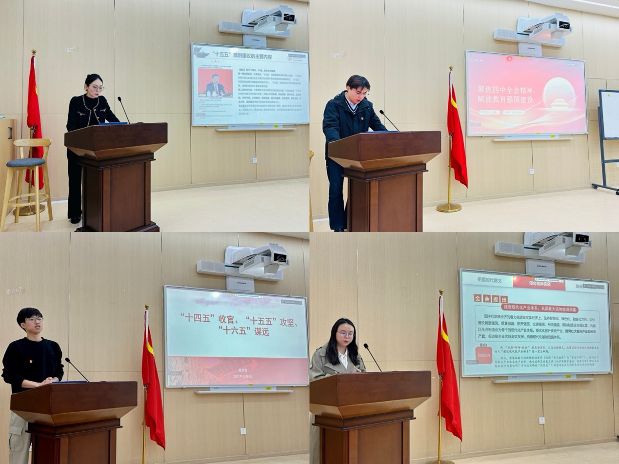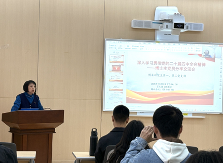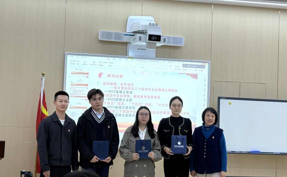 在学习交流环节,四位博士生党员分享了学习心得和体会。李佳聚焦“数据赋能中国式现代化建设”,探讨了数字技术提升治理效能的途径;占勇从精神领航、专业融合、青年担当三个方面强调教育强国建设的重要性;曾彦强以“‘十四五’收官、‘十五五’攻坚、‘十六五’谋远”为题,解析国家发展各阶段的重点任务;黄丽萍通过深刻解读全会精神,提出公共管理重点研究的五个方向。